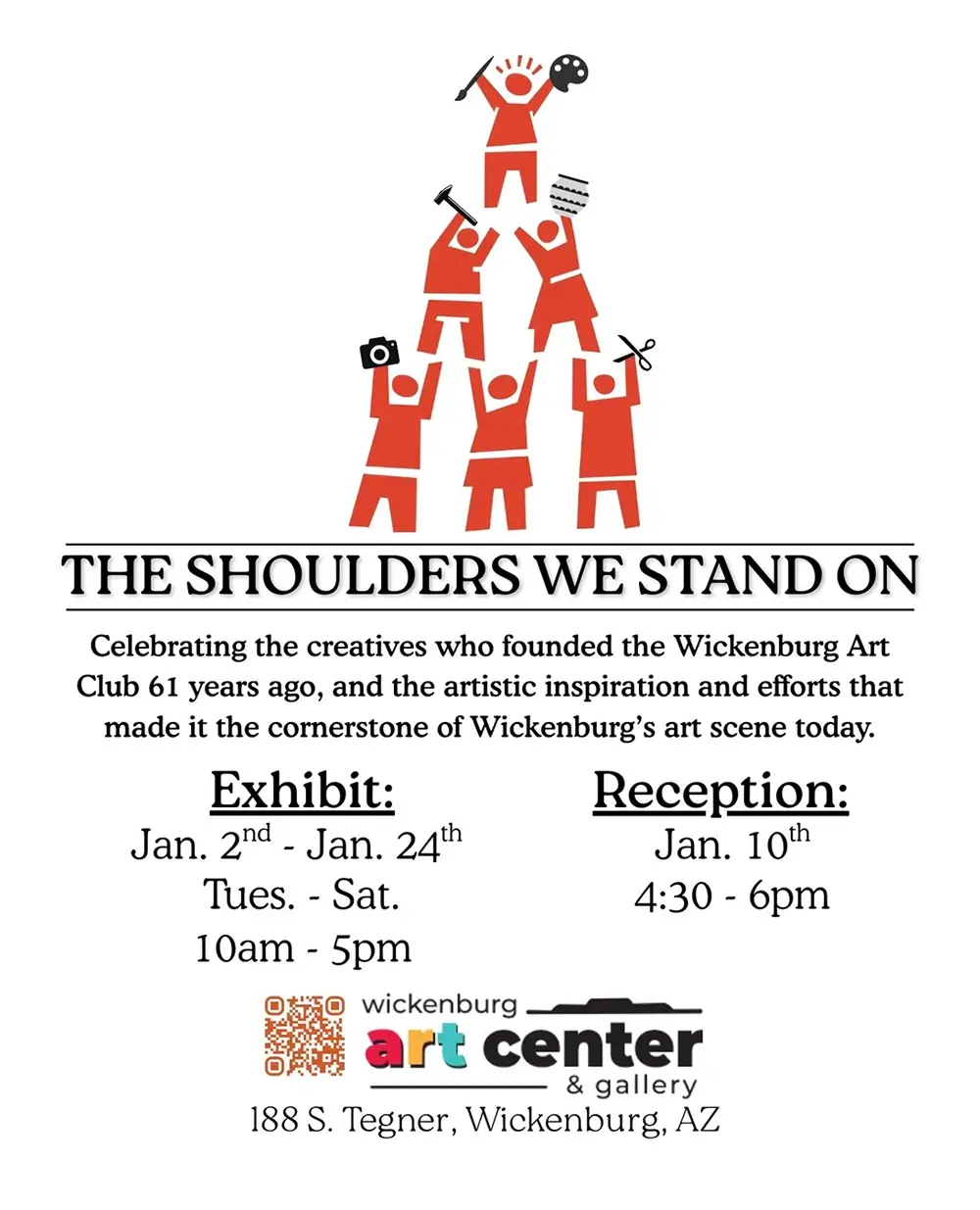 The Wickenburg Art Center & Gallery starts the 2026 New Year by celebrating the past 61 years of Wickenburg art. The Shoulders We Stand On exhibit showcases artists that started the Wickenburg Art Club in 1965 and those who have been a part of the organization for 10 years or more.  In addition to the fine art created and displayed by these artists, the exhibit includes historical photographs and commentary highlights, providing viewers insight into the founding and growth of the Wickenburg Art Club. The Shoulders We Stand On is open to the public from January 2nd through January 24th at the Wickenburg Art Center and Gallery, located at 188 South Tegner Street in Wickenburg.